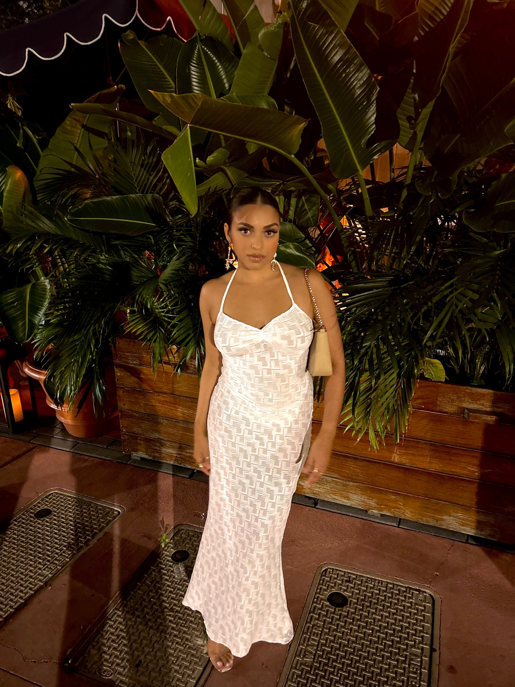 The sun dress of your dreams. Be sure to turn heads in this snatching, second-skin slip dress. Semi sheer, light weight and form fitting with a one of a kind textured geometric print.